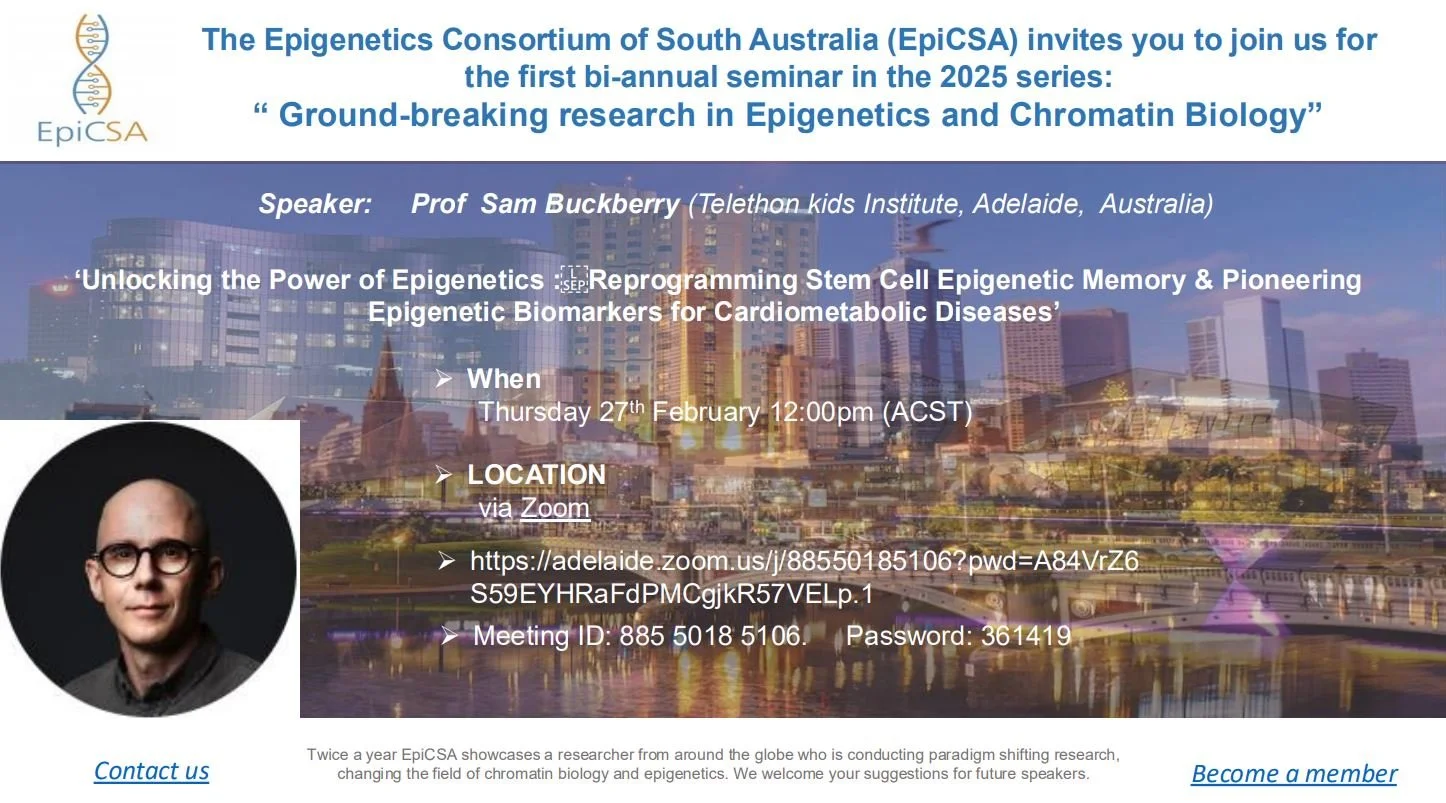 Epigenetics Consortium of South Australia (EpiCSA) Thursday, February 27, 2025 1:30 PM 6:00 PM Zoom (map) Google Calendar ICS Please note the time is based on Adelaide time (ACDT) Zoom
